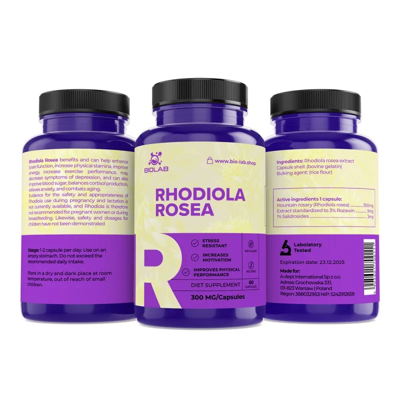 Rhodiola, även känd som arktisk rot, innehåller mer än 140 biologiskt aktiva beståndsdelar, av vilka rosavin och salidrosid spelar en nyckelroll. Dess egenskaper är att stödja naturliga anpassningsmekanismer, vilket främjar välbefinnande och upprätthåller optimala energinivåer under hela dagen.