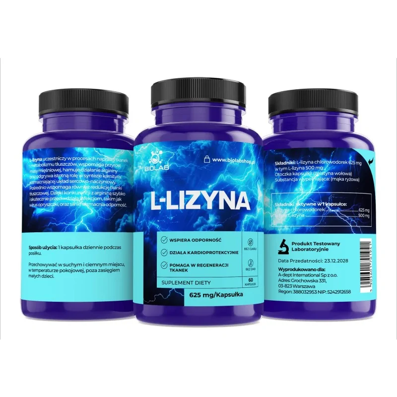 L-lysin är viktigt för proteinsyntesen, vilket främjar vävnadstillväxt och -reparation och allmänt hälsounderhåll. Det stöder muskelutveckling och regenerering, särskilt hos idrottare och de som är involverade i fysisk träning.