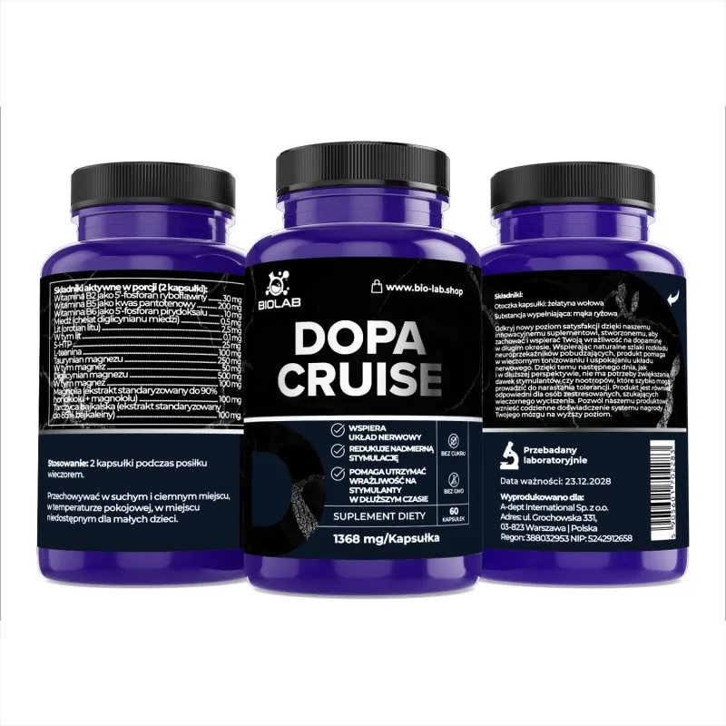 En drömåterställning för dagens hektiska tempo. Dopa Cruise hjälper dig att hålla dig lugn, minska spänningar och hålla dig alert, även när världen runt omkring dig är full av stimuli. Dopa Cruise är en uppsättning ingredienser för att stödja nervsystemet i situationer med stress och överanvändning av stimulantia. Sammansättningen kombinerar B-vitaminer, mineraler, aminosyror och naturliga extrakt med avslappnande och humörstabiliserande effekter. Produkten kan bidra till att minska spänningar, förbättra utflödet av upphetsning och upprätthålla ett mer stabilt kroppsligt svar på yttre stimuli.