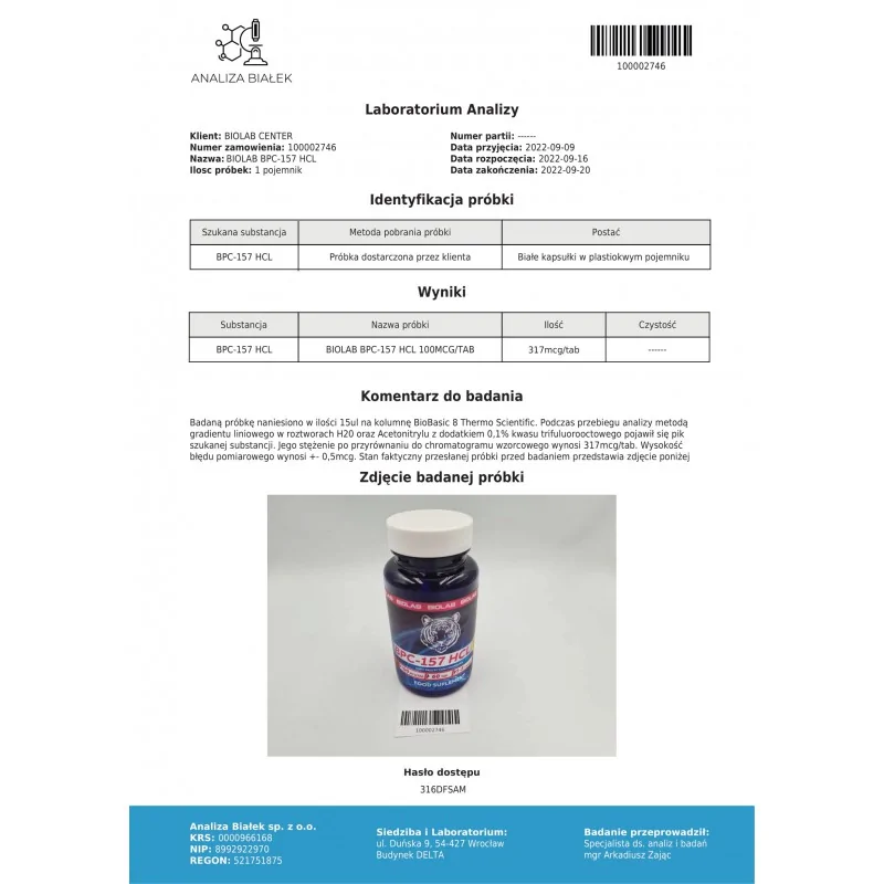 BIOLAB BPC-157 HCL 100 mcg (60 kapslar) med laboratoriebekräftat innehåll av den aktiva substansen - testet visade 317 mcg/kaps., vilket bekräftar närvaron av substansen i produkten.