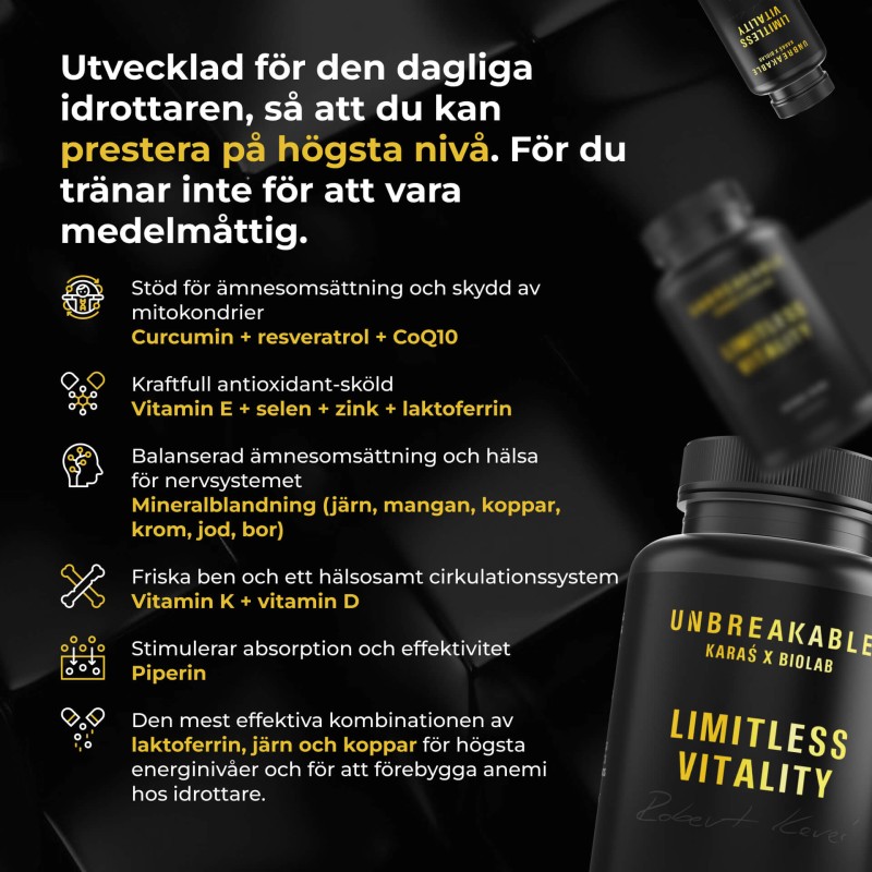 Beställ Limitless Vitality från serien UNBREAKABLE Karaś x Biolab redan idag och upplev energi, fokus och återhämtning på en högre nivå – för idrottare och alla som vill tänja på sina gränser.